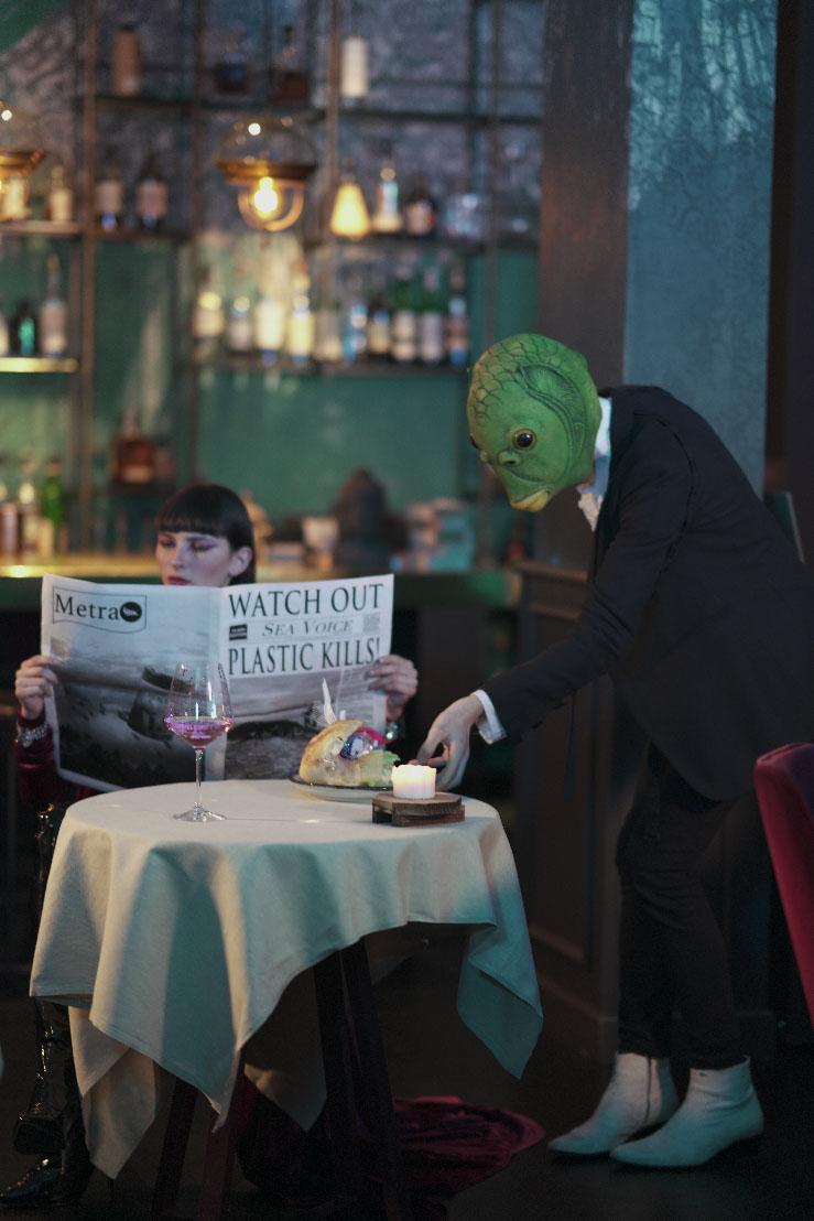 Una scena apparentemente surreale, lynchiana: nella sofisticata atmosfera di un ristorante, esseri umani e umanoidi - dalla testa di pesce - convivono e cenano come se nulla fosse. L’umanità raccontata è quella post-umana, mutante, già stravolta dall’impatto delle attività dell’uomo e dell’inquinamento dei mari e degli oceani. Uno short film, che ci mostra attraverso il linguaggio dell’assurdo, come le buone maniere di una cena elegante convivano con le pessime abitudini alimentari che hanno trasformato l’idrosfera in un oceano di plastica.